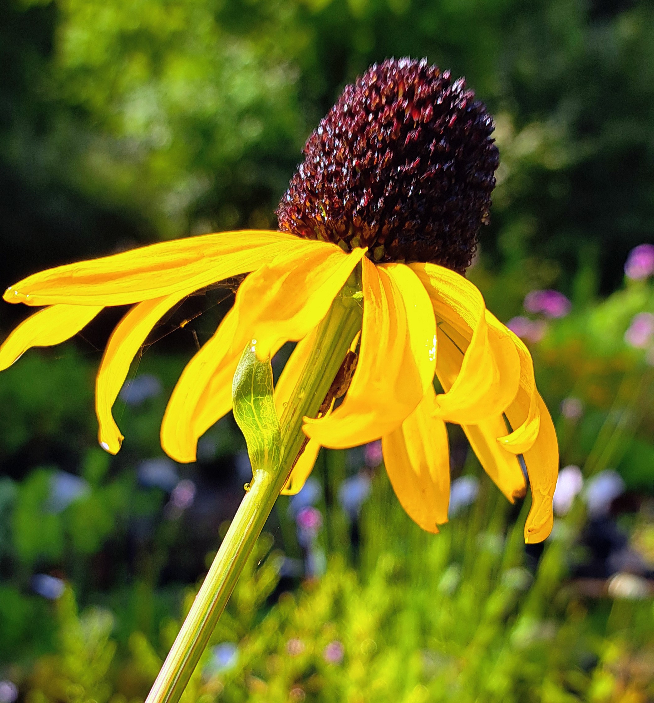 Blüte: gelb, hängende Blütenblätter, brauner Kegel