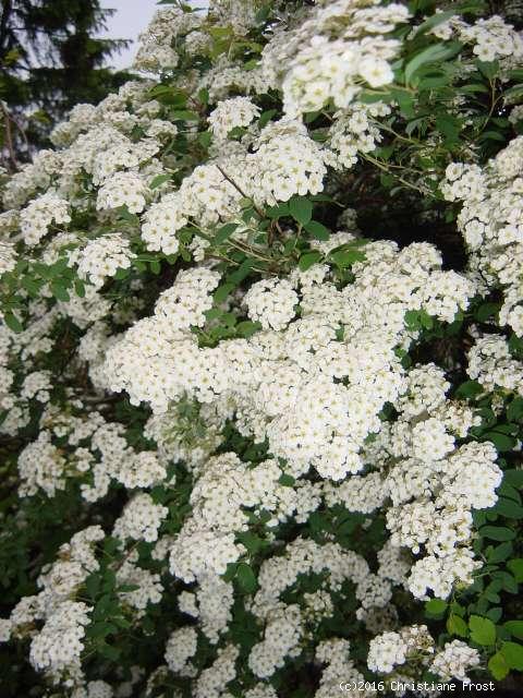Blüte: weiß, 8 mm breit, in dichten, halbrunden Doldentrauben, außerordentlich reich blühend entlang der vorjährigen Triebe, Mai / Juni