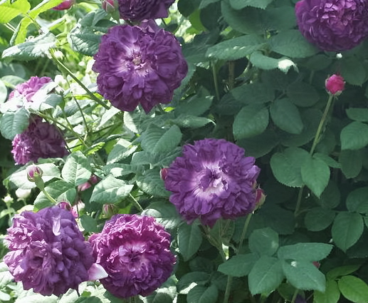 Blüte : samtig dunkel-purpurviolett, mittelgroß, ballförmig, in kleinen Gruppen stehend, reichblühend