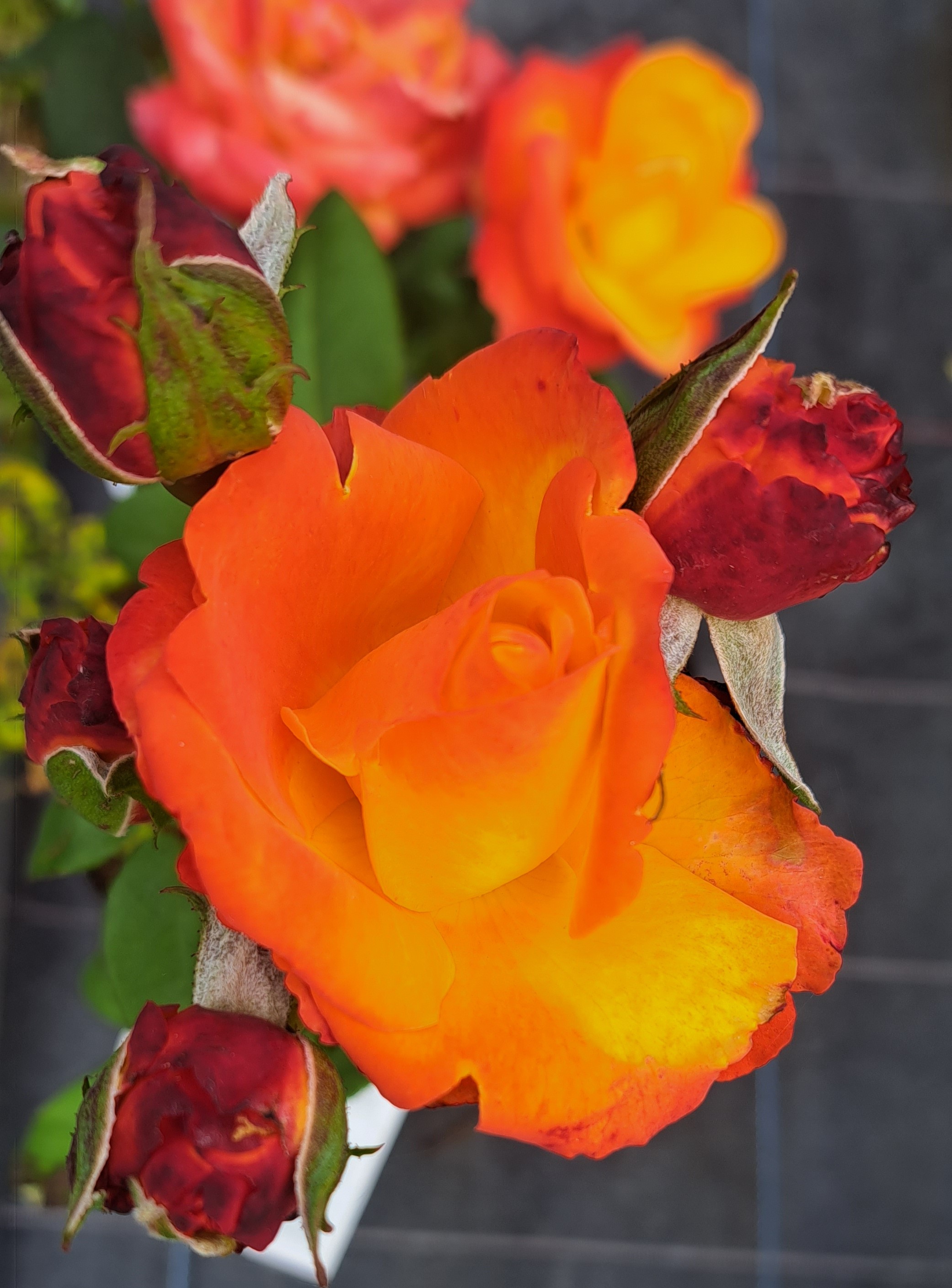 Blüte: Wechselspiel von goldgelb, orange mit zinnoberroten Schattierungen, hohe Leuchtkraft, gut gefüllt