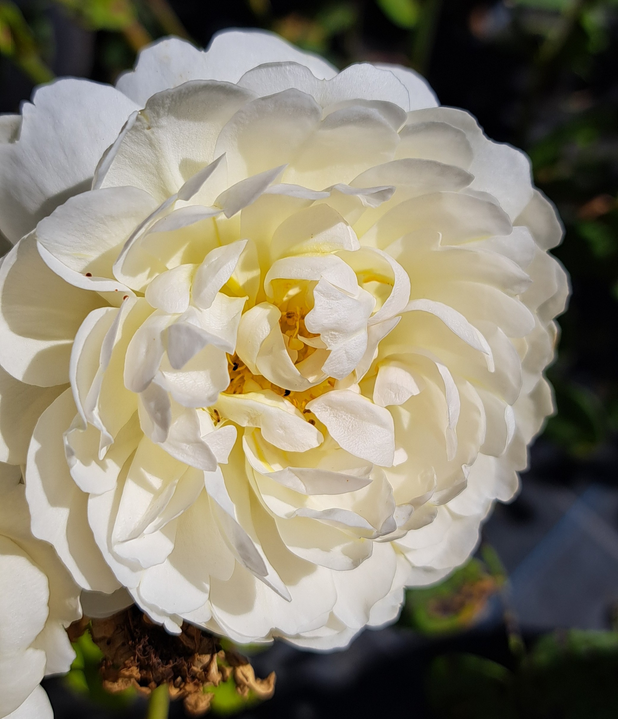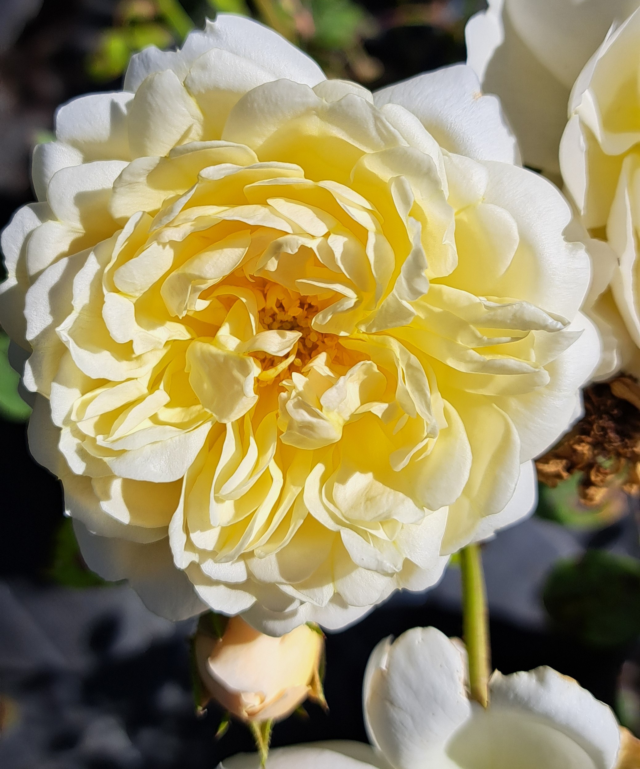Blüte : Hellgelb mit dunklerem Zentrum, gelbe Staubgefäße, mittelgroß, viele Blütenblätter, aber locker aufgebaut